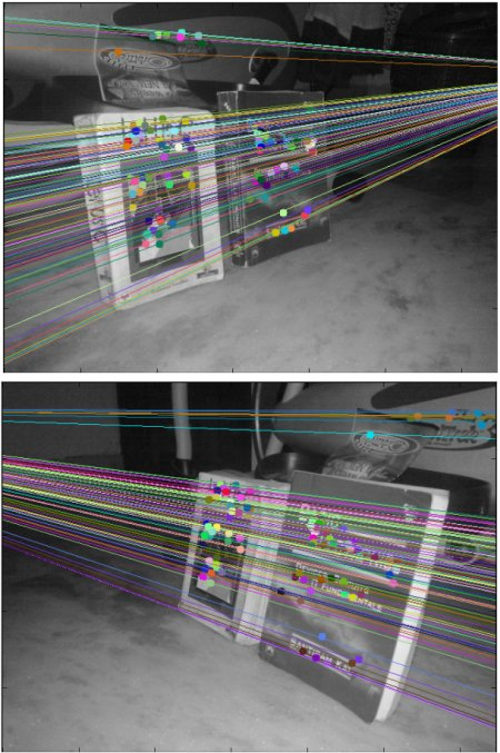 但是我们会更喜欢在像素坐标中进行测量,对吧? 基本矩阵除包含有关两个摄像头的内在信息之外,还包含与基本矩阵相同的信息,因此我们可以将两个摄像头的像素坐标关联起来。(如果我们使用的是校正后的图像,并用焦距除以标准化该点,$F=E$)。简而言之,基本矩阵F将一个图像中的点映射到另一图像中的线(上)。这是从两个图像的匹配点计算得出的。 至少需要8个这样的点才能找到基本矩阵(使用8点算法时)。 选择更多点并使用RANSAC将获得更可靠的结果。