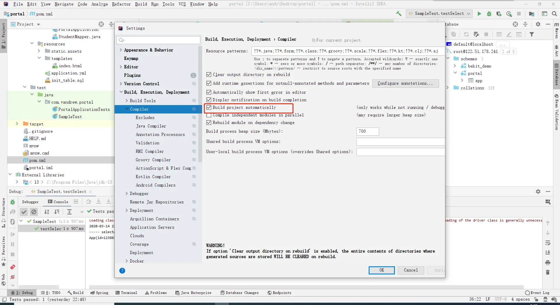 最后设置Idea修改后自动编译,或者修改后使用Ctrl+Shift+F9手动编译,不编译改动不会生效