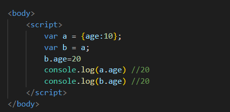 引用类型:引用类型变量在内存中分两块存储,变量a存储的只是一个指针,变量b存储的是另一个指针,变量a、b同时指向{age:10},所以b.age的修改会影响到a.age。