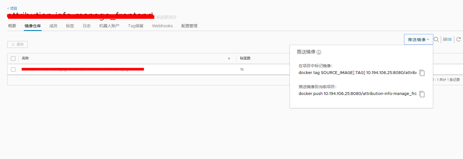 点击项目详情,镜像仓库选项,点击右侧推送镜像按钮即可查看镜像推送示例命令