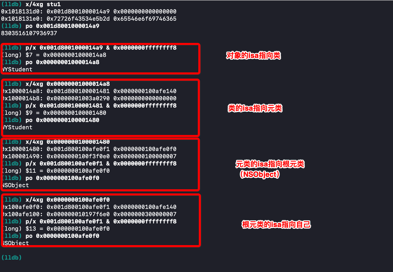 通过上面同样的方式来验证,类是isa指向元类,元类的isa指向根元类,根元类的isa指向自己.
