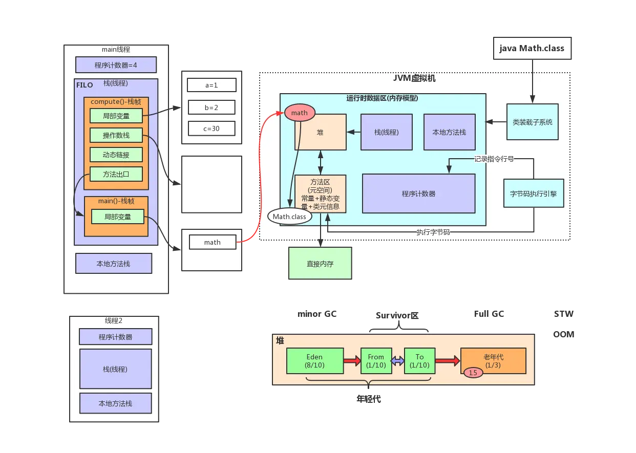 针对以上代码,JVM运行时的整体结构如图所示