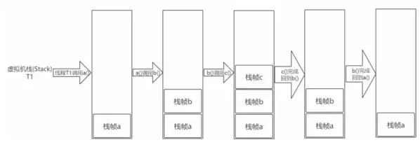 虚拟机栈是一个线程执行的区域,保存着一个线程中方法的调用状态。换句话说,一个Java线程的运行状态,由一个虚拟机栈来保存,所以虚拟机栈肯定是线程私有的,独有的,随着线程的创建而创建。每一个被线程执行的方法,为该栈中的栈帧,即每个方法对应一个栈帧。调用一个方法,就会向栈中压入一个栈帧;一个方法调用完成,就会把该栈帧从栈中弹出。