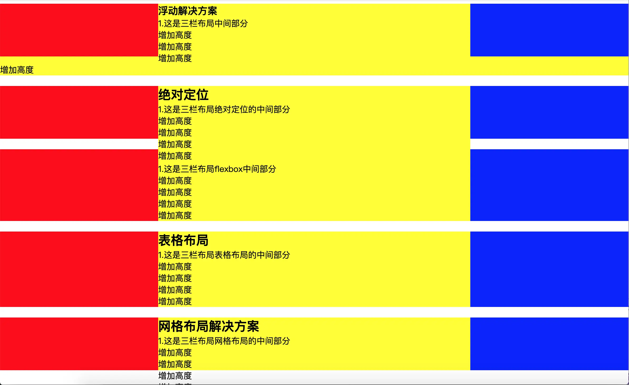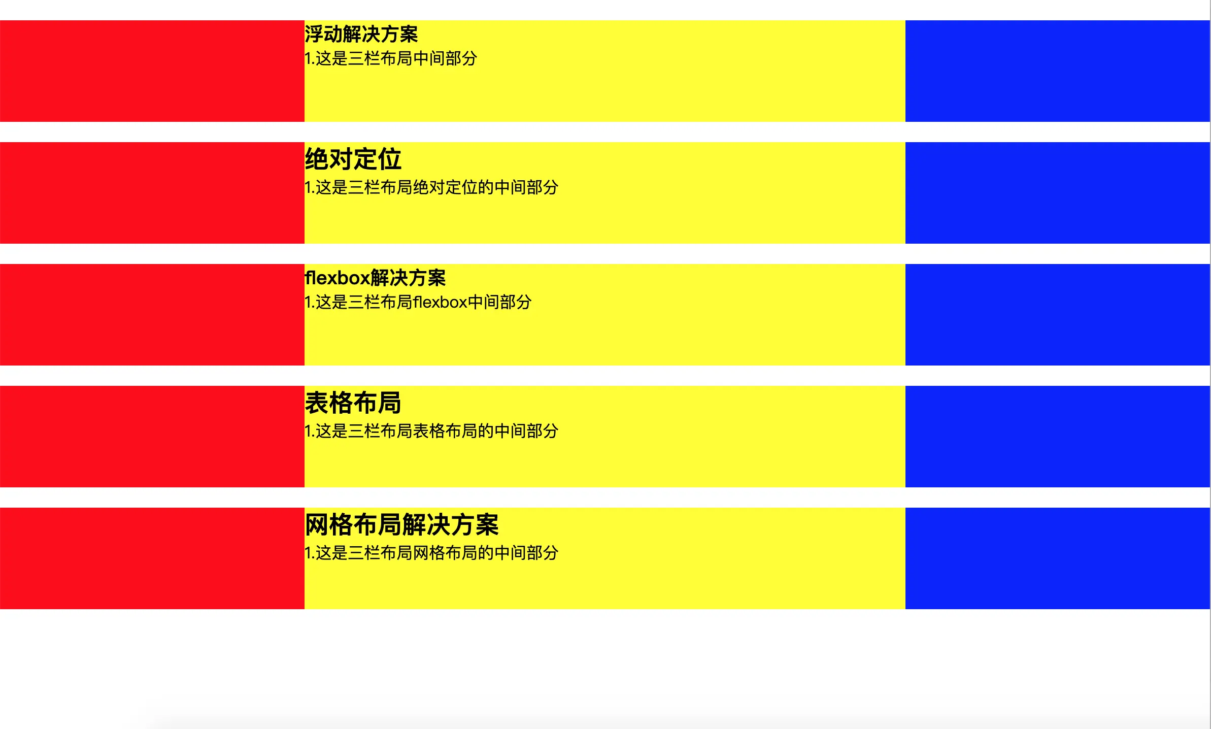 | 缺点 | 需清除浮动造成的影响 | 脱离了文档流(子绝父相) | ie8以下不兼容 | table标签不正规使用;内容高度不一致时不适应;语义化不太好 | 浏览器兼容性问题 |