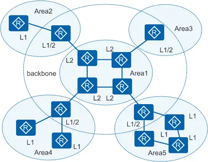 • Level-1-2路由器维护两个LSDB,Level-1的LSDB用于区域内路由,Level-2的LSDB用于区域间路由。它可以与同一区域的Level-1和Level-1-2路由器形成Level-1邻居关系,也可以与其他区域的Level-2和Level-1-2路由器形成Level-2的邻居关系。Level-1路由器必须通过Level-1-2路由器才能连接至其他区域。
