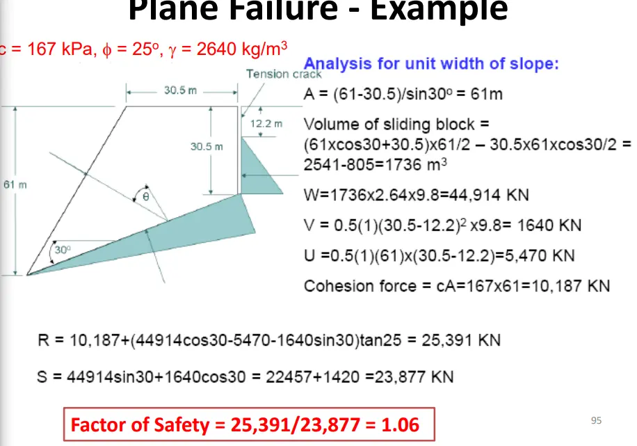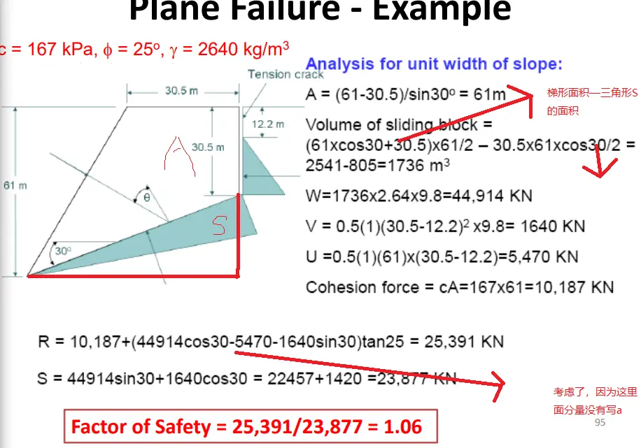 1.水在Tension Crack 里面的,水压力随着深度线性增加,然后整个滑坡的下滑分量力V增加,同时V传导到Base去,产生了一个与支持力方向相同的力U,到hi支持力Nx下降,之后摩擦力减小,减小了Shear Strength
