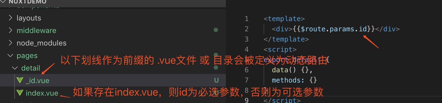如果要定义动态路由,以下划线作为前缀的 .vue文件或目录会被定义为动态路由,如下所示