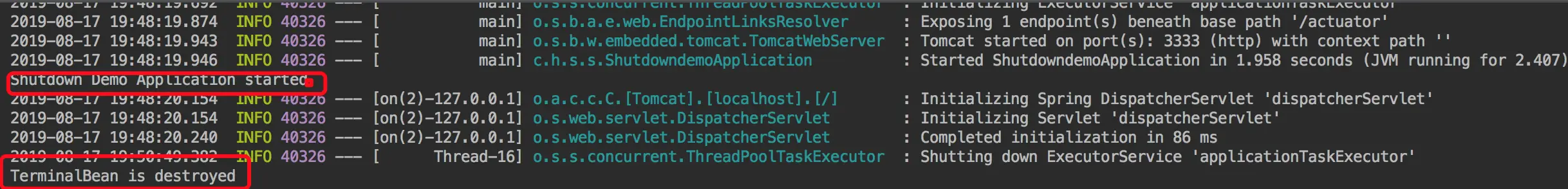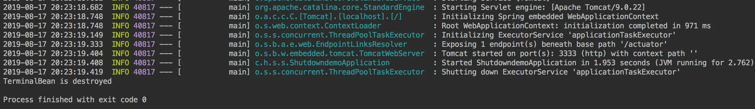 curl -X POST http://localhost:3333/actuator/shutdown以下日志可以输出启动时的日志打印和停止时的日志打印,同时程序已经停止。是不是比较神奇。
