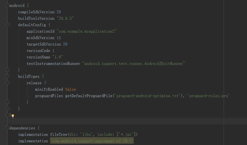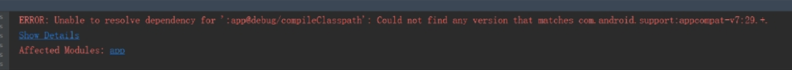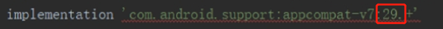 从依赖文件看需要的sdk版本是29,依赖的com.android.support:appcompat-v7这个组件也是29版本的sdk: