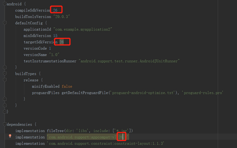 因此,将build.gradle文件中的sdk版本都修改为api 26就可以解决问题,按照下图修改这三处地方就可以解决该问题: