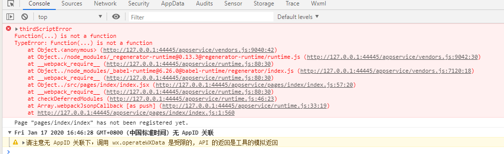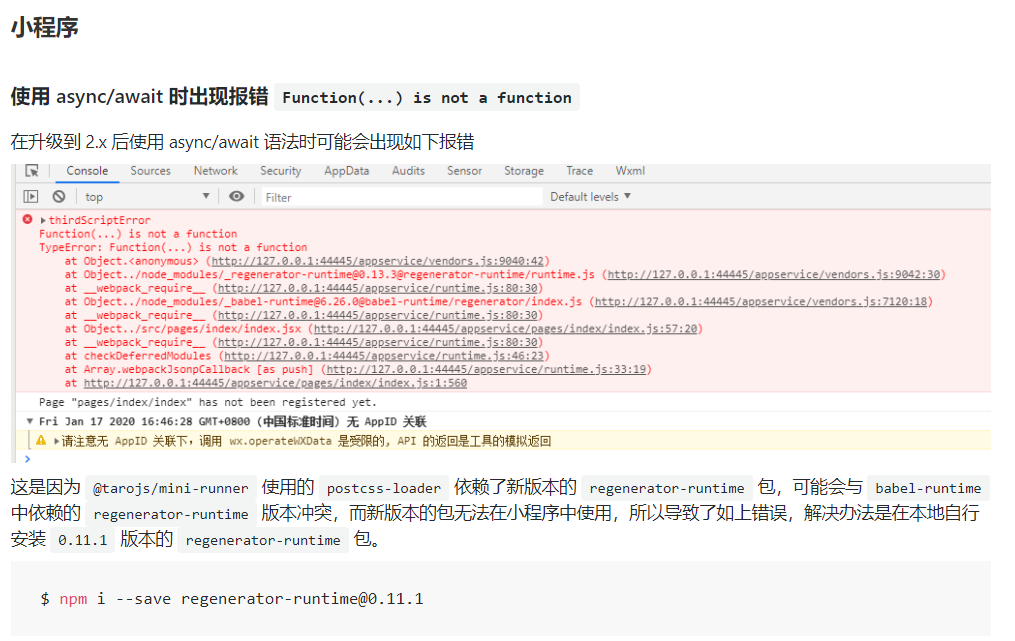 但是,在使用过程中,只要使用了async/await的页面,微信小程序和支付宝小程序都报一个错误