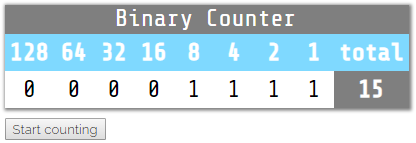 如果单击第 2 行中的任何单元格,它将把表头中的数字添加到总值中。你也可以点击 “start counting” 按钮来观看从 0 到 255 的计数效果。