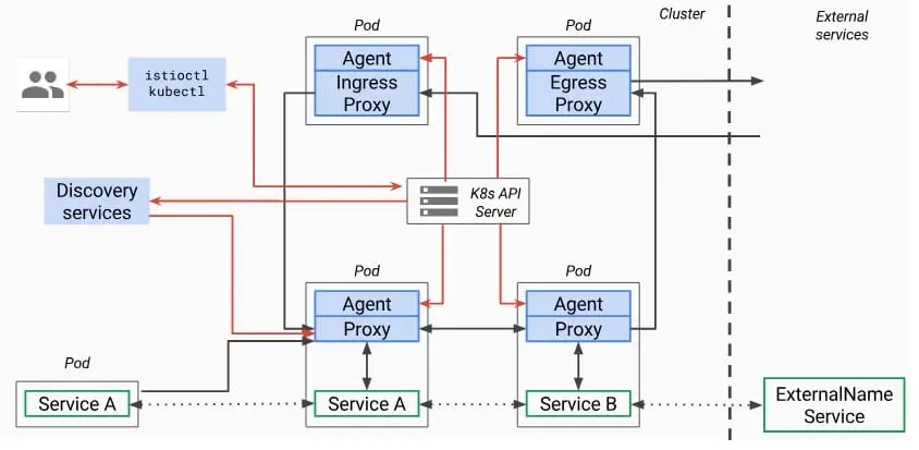 我们看到 pilot 主要包含 2 个组件,即 Discovery services 和 Agent。