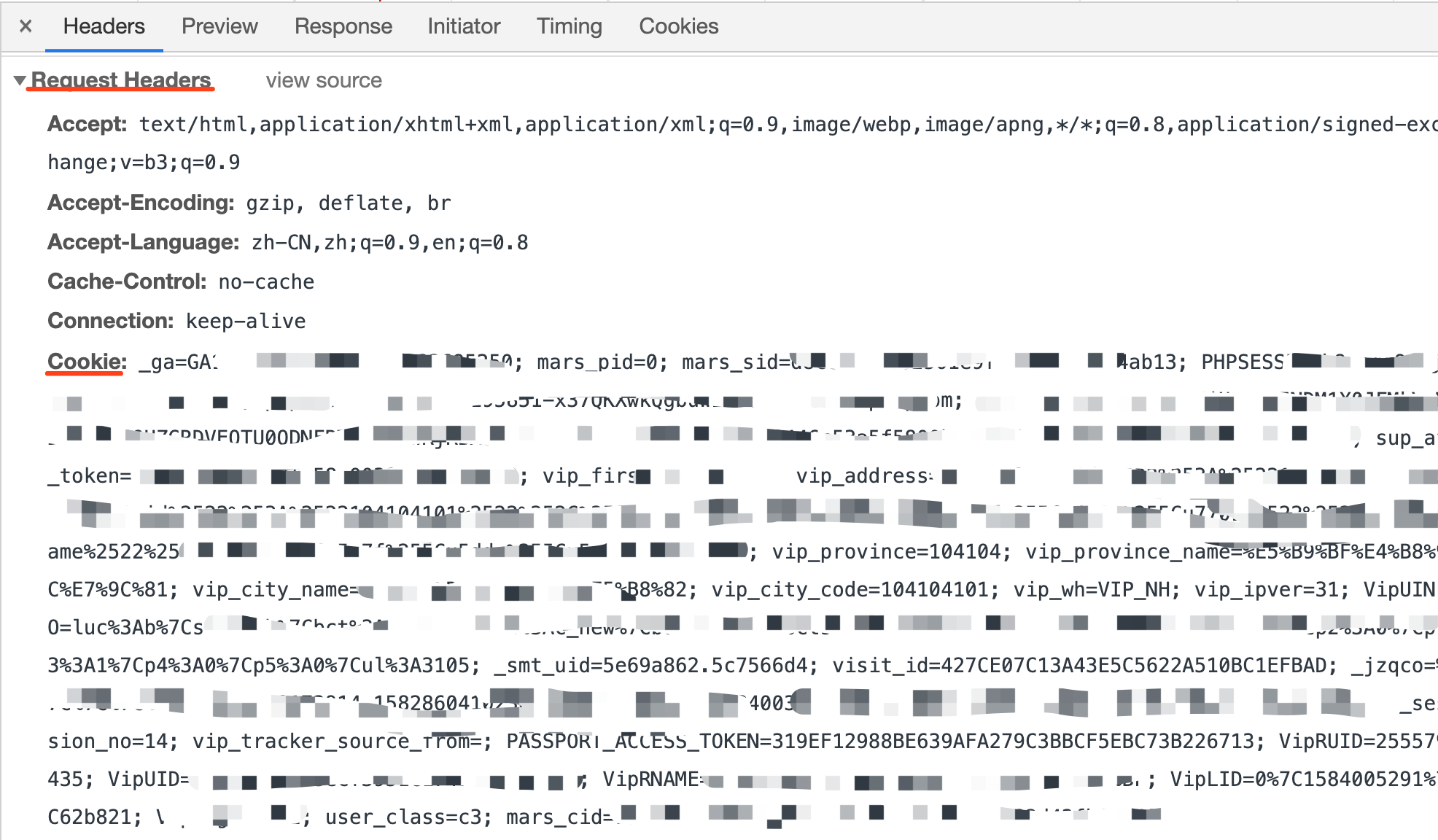 要看到cookie并不难,打开浏览器的开发工具,点开一个request就可以观察到了。比如我这里访问www.vip.com/登录成功后点开www.vip.com/,在Headers一列中可以看到Response Headers和Request Headers都有cookie部分: