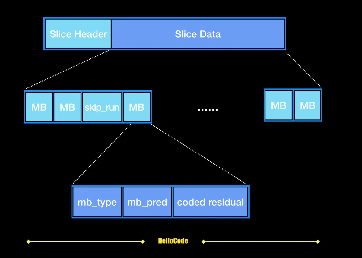 每个切片都包括切片头+切片数据. 那每个切片数据包括了很多宏块.每个宏块包括了宏块的类型,宏块的预测,残差数据.
