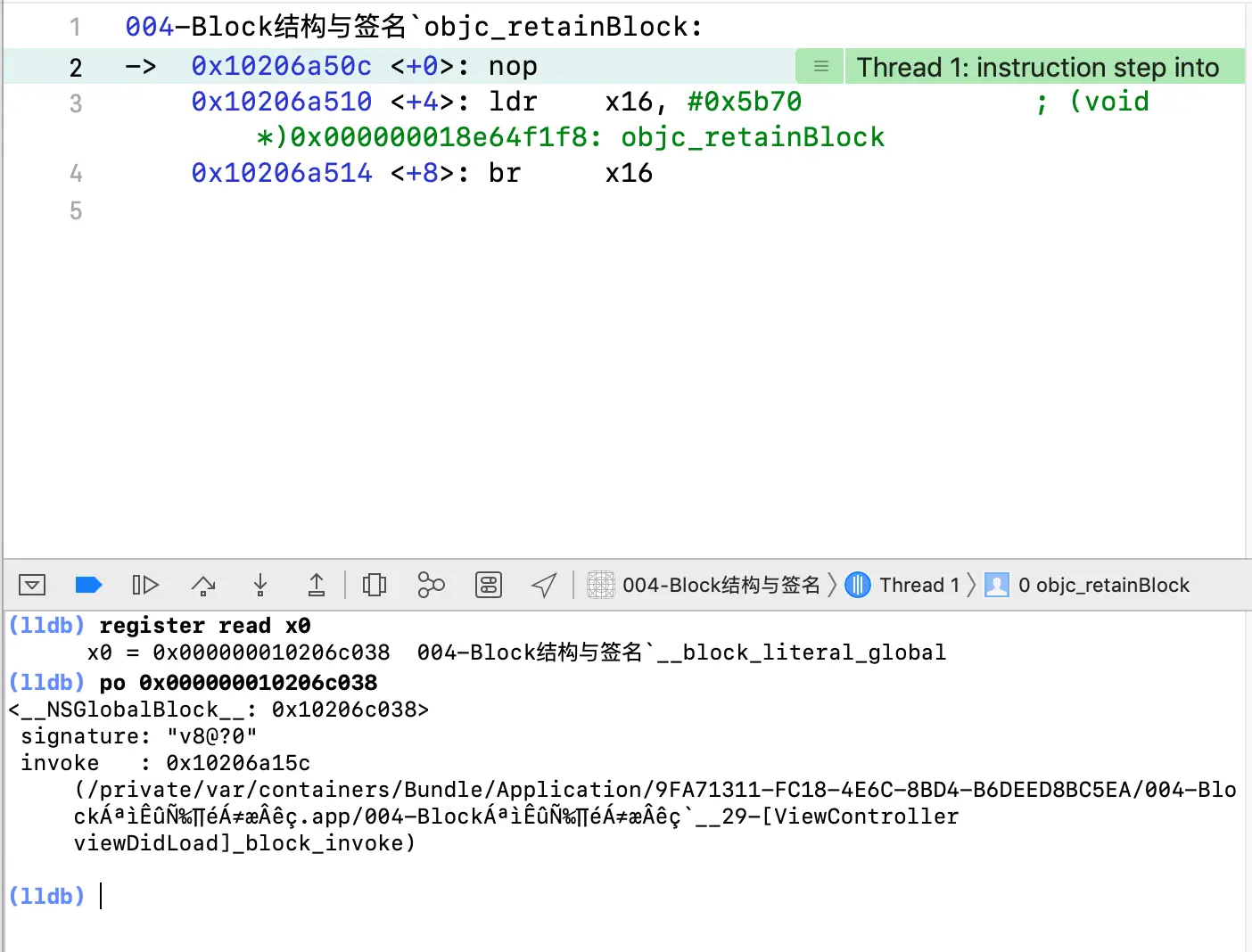 我们发现在这个函数里面通过malloc在堆区创建了传进来参数相同的内存空间,并且将原来block的forwarding指向了新block,因为原block的forwarding指向的是自己,这样就实现了在block内部可以修改原来变量的能力,这是为什么呢,我们来看看,