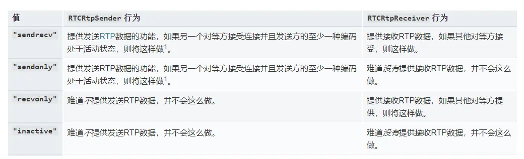 direction:收发器的首选方向性。此值用于初始化新RTCRtpTransceiver对象的RTCRtpTransceiver.direction属性。