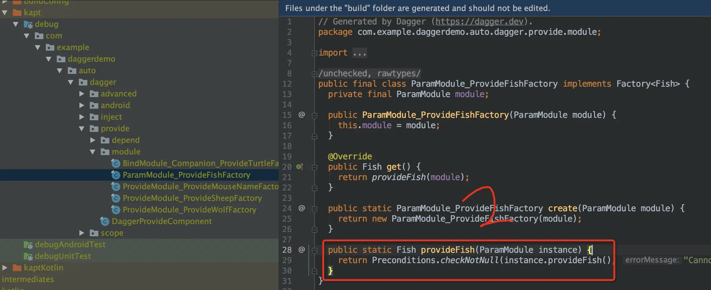 @Module class ParamModule constructor(val name:String) { @Provides fun provideFish():Fish{ return Fish(name) } }@Component(modules = [ParamModule::class]) interface ProvideComponent { fun getPig(): Pig fun getFish():Fish }可以看到Fish最终是由ParamModule类提供的 fun main() { //静态方法create()快速创建Dagger组件 //DaggerProvideComponent.create().run { // getPig().description() // } //建造者模式创建Dagger组件,当组件需要传值时(如添加了有参构造函数的ParamModule时)一定得>使用建造者模式创建 //并且需要手动设置module,不然会报错 DaggerProvideComponent.builder().paramModule(ParamModule("鲤鱼泡泡")).build().run { getPig().description() getFish().description() } }
