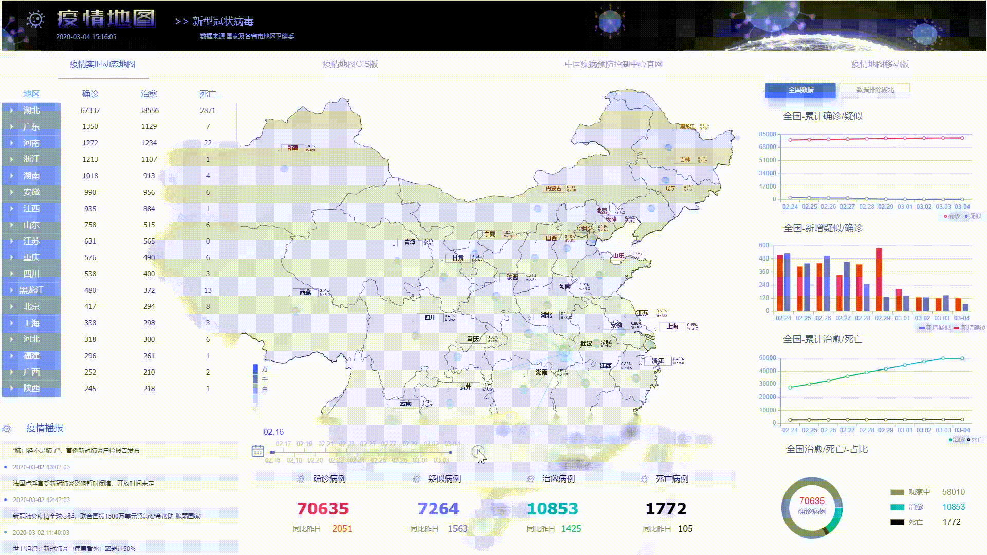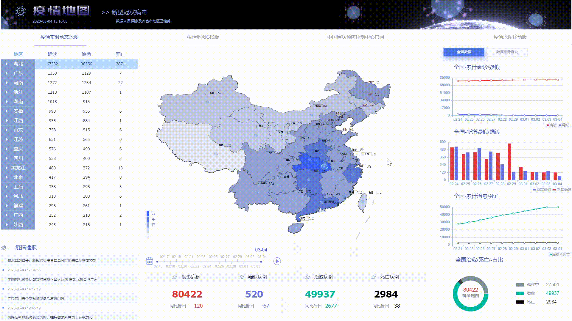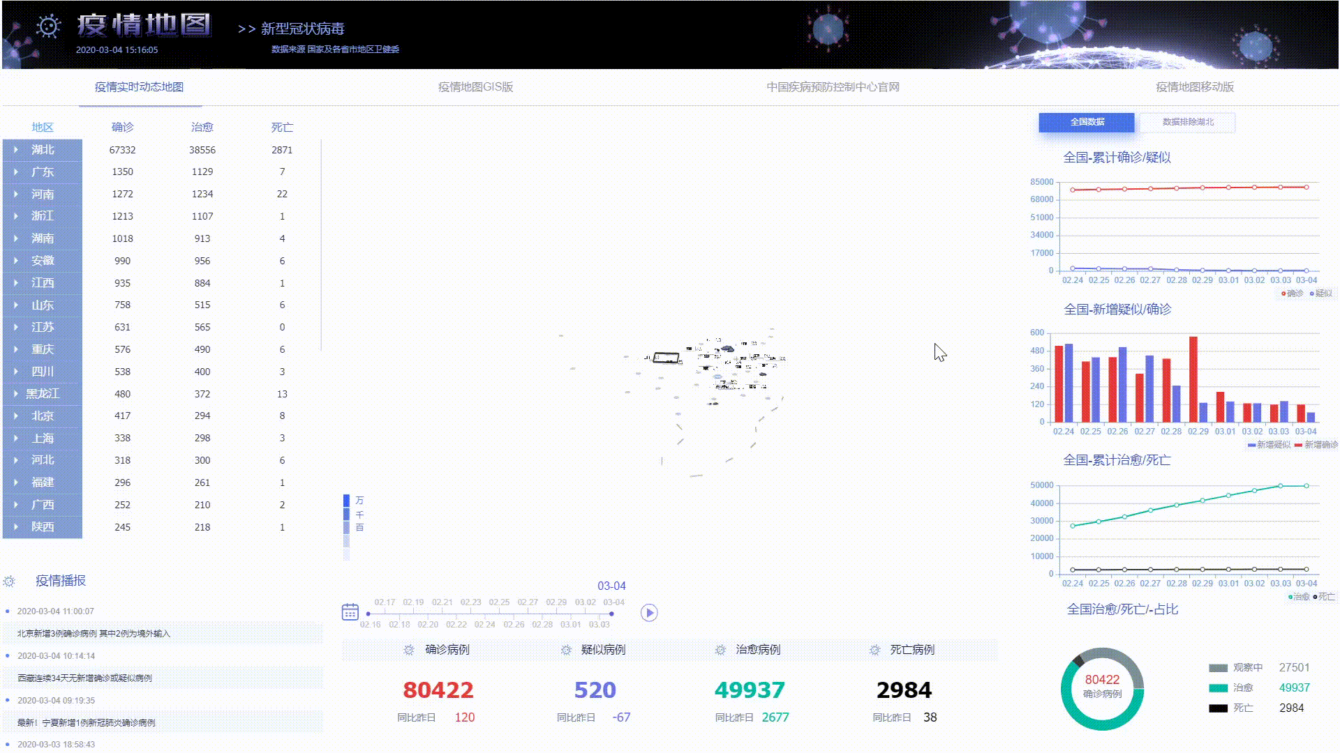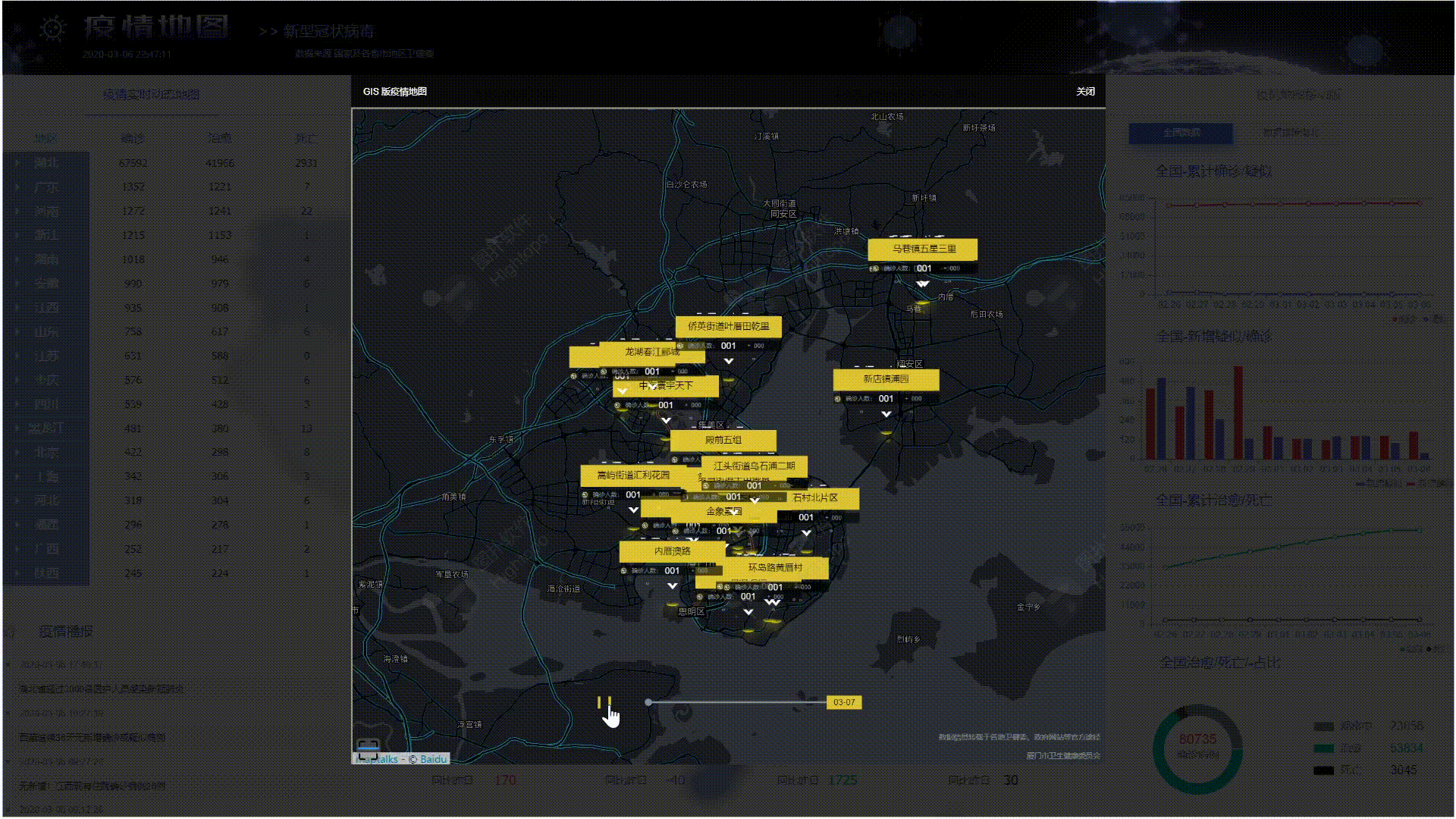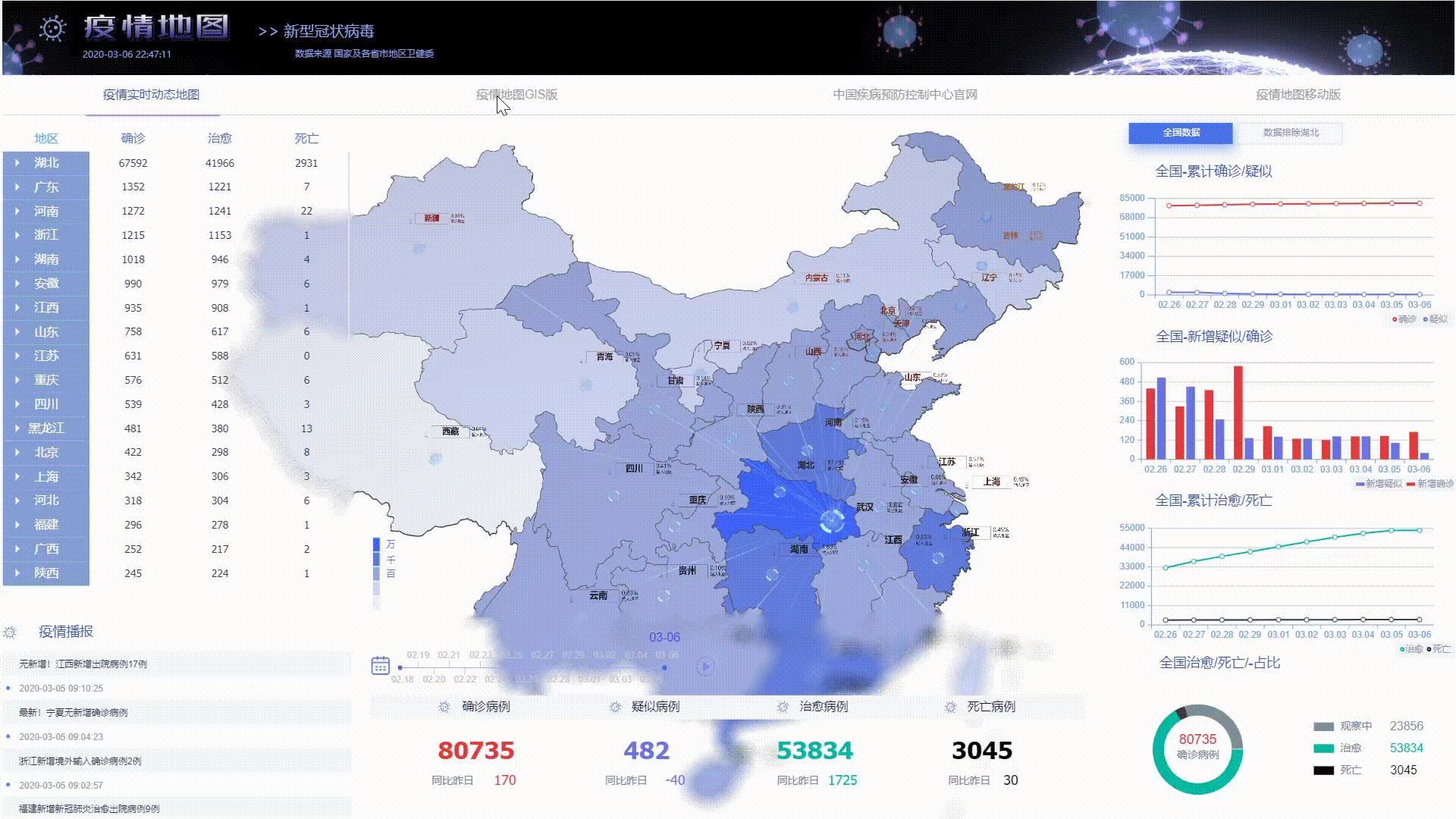 1.先从左上的表格开始,这部分展示了各省的累计数据和该省份各地区的数据,可点击展开或折叠,点击 3D 地图相应的位置筛选出该地区的相应数据单独展示,点击空白处恢复显示全国数据。 2.接下来是左下的疫情播报部分,这部分的数据采集了各地卫健委数据轮播展示,这里加上了表格纵偏移缓动效果使得滚动更自然美观。 3.底部最显眼的是最新的确诊,疑似,治愈,死亡等数据,往上的位置还有一条时间轴,点击旁边的播放按钮会动态改变页面的数据,根据不同日期各地区确诊人数来对地图染色,与旁边的色卡对比能清晰地观察出各地区疫情的严重程度。 4.右侧图表展示了按时间排序的确诊,疑似,治愈,死亡等数据,一眼就能从图表中读出疫情的发展趋势。 5.上方导航栏,点击可预览 GIS 版的疫情地图, CDC 官网, 还有移动版的疫情地图。