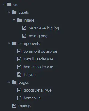 components:存组件(commonFooter.vue、DetailHeader.vue、homeHeader.vue、list.vue)