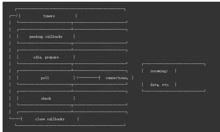 - close callbacks: 执行close事件的callback,例如socket.on('close'[,fn])或者http.server.on('close, fn)。
