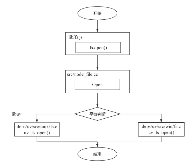 fs.open()的作用是根据指定路径和参数去打开一个文件,从而得到一个文件描述符,这是后续所有I/O操作的初始操作。从前面的代码中可以看到,JavaScript层面的代码通过调用C++核心模块进行下层的操作。