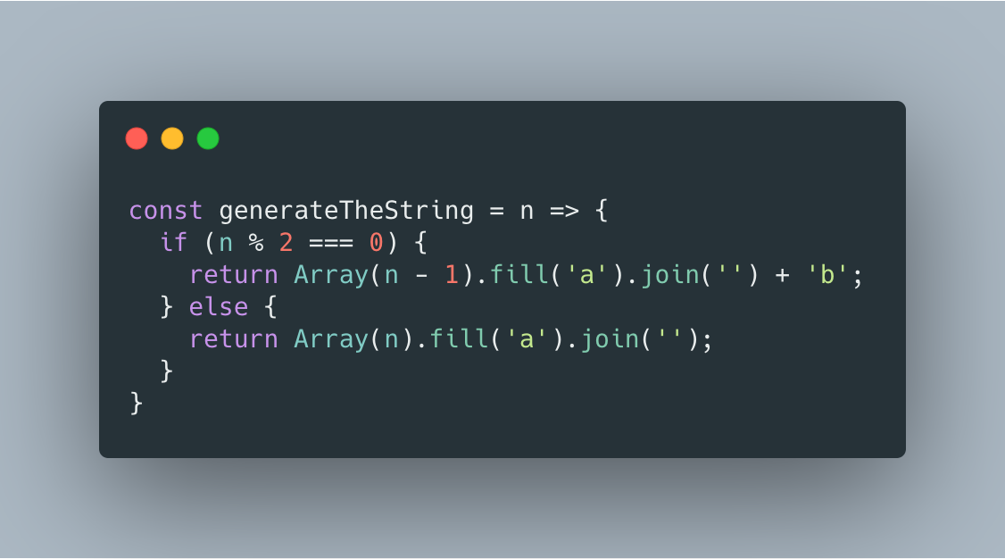 给你一个整数 n,请你返回一个含 n 个字符的字符串,其中每种字符在该字符串中都恰好出现 奇数次 。 返回的字符串必须只含小写英文字母。如果存在多个满足题目要求的字符串,则返回其中任意一个即可。 示例: 输入:n = 4 输出:'pppz' 解释:'pppz' 是一个满足题目要求的字符串,因为 'p' 出现 3 次,且 'z' 出现 1 次。当然,还有很多其他字符串也满足题目要求,比如:'ohhh' 和 'love'。