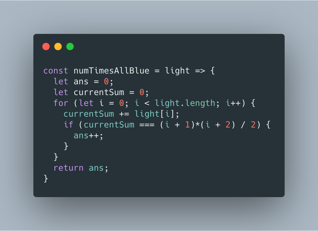 第一种解法:如果此刻所有开着的灯是一个 1 到 n 的排列,那么此刻开着灯的最大下标应该和数量一致。
