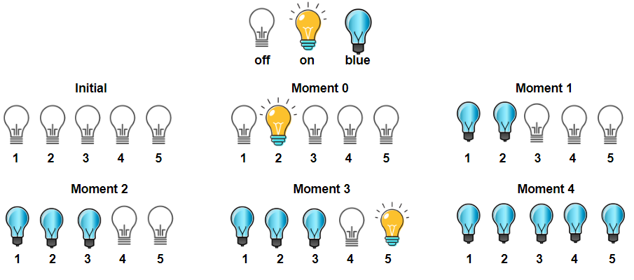 如果要求某个时刻打开的灯都变蓝,那么此时开着的灯应该是一个 1 到 n 的排列。