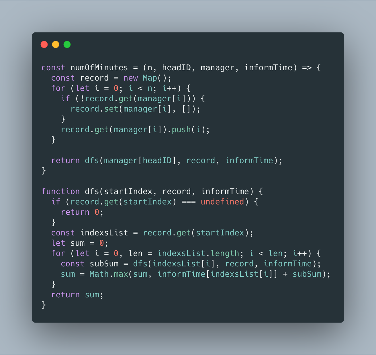第二步:由于每一个领导的通知时间强依赖直属下属的通知时间,所以在DFS (深度优先搜索算法)的过程中,需要向上传递当前节点所花费的通知时间。