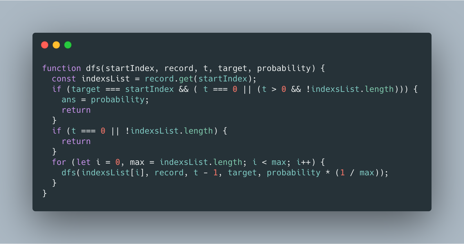 给你一棵由 n 个顶点组成的无向树,顶点编号从 1 到 n。青蛙从 顶点 1 开始起跳。规则如下: 在一秒内,青蛙从它所在的当前顶点跳到另一个 未访问 过的顶点(如果它们直接相连)。 青蛙无法跳回已经访问过的顶点。 如果青蛙可以跳到多个不同顶点,那么它跳到其中任意一个顶点上的机率都相同。 如果青蛙不能跳到任何未访问过的顶点上,那么它每次跳跃都会停留在原地。 无向树的边用数组 edges 描述,其中 edges[i] = [fromi, toi] 意味着存在一条直接连通 fromi 和 toi 两个顶点的边。 返回青蛙在 t 秒后位于目标顶点 target 上的概率。 示例: 输入:n = 7, edges = [[1,2],[1,3],[1,7],[2,4],[2,6],[3,5]], t = 2, target = 4 输出:0.16666666666666666 解释:上图显示了青蛙的跳跃路径。青蛙从顶点 1 起跳,第 1 秒 有 1/3 的概率跳到顶点 2 ,然后第 2 秒 有 1/2 的概率跳到顶点 4,因此青蛙在 2 秒后位于顶点 4 的概率是 1/3 * 1/2 = 1/6 = 0.16666666666666666 。