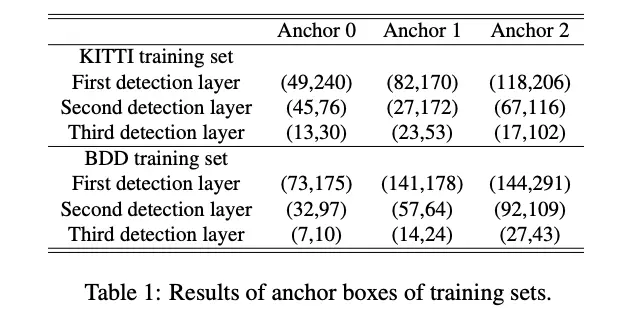 在不同的数据集上每个detection layer的anchor设计如表1