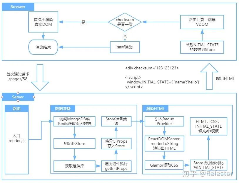 Store 中存储了组件树和组件属性数据,直出的不仅仅是 HTML,还包括对应的 CSS,这里使用 css in js 方案 Glamor,渲染 HTML 的同时,也可以提取对应的 CSS。
