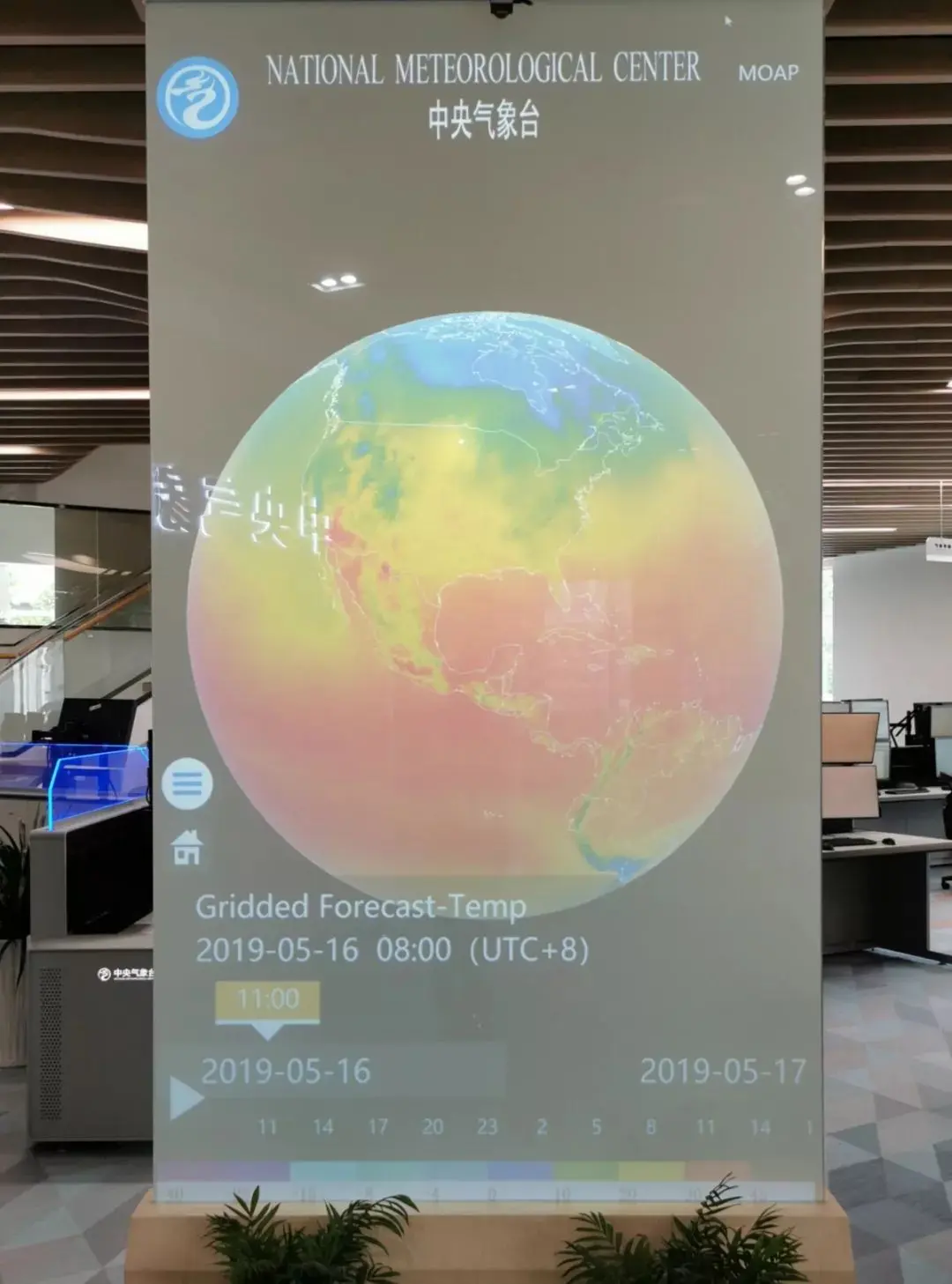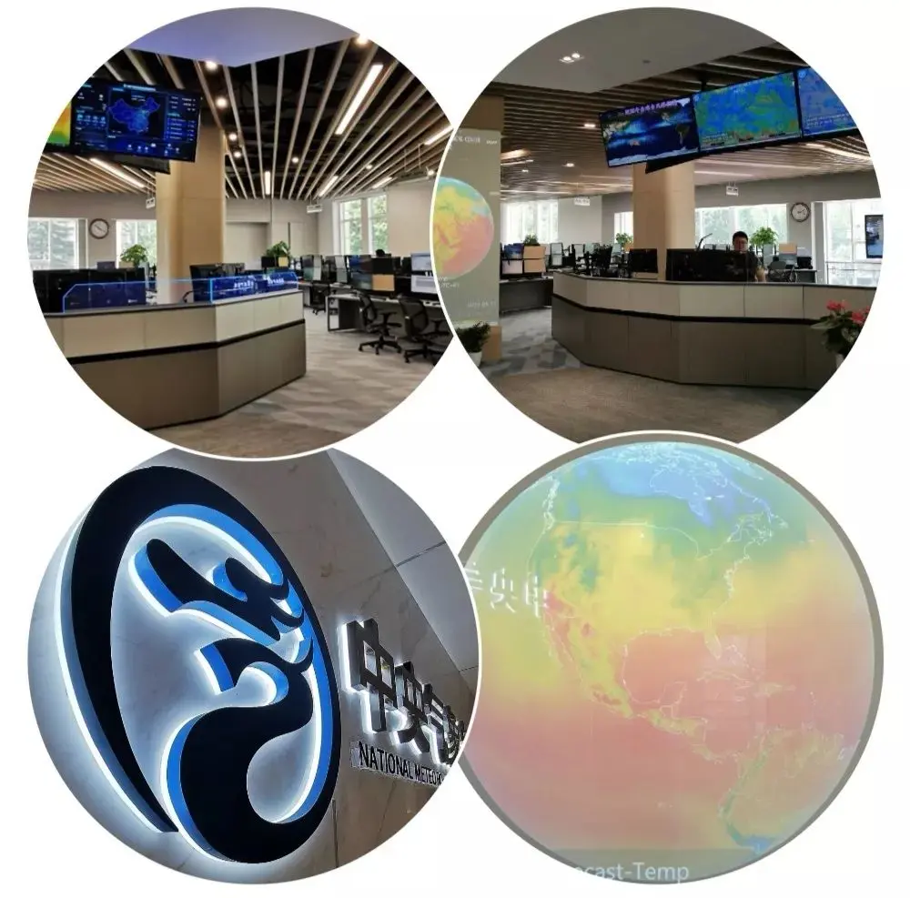 在“蔚蓝苍穹”的左侧,一个透明蓝色星球在实时运转,这是中央气象台自主研发的集触控式、交互式、二三维一体化的天气监测预报系统 -----“智慧寰球”。“智慧寰球”代表了国家级综合实况监测和预报的信息化和智能化水平,是对气象数据可视化技术的一次崭新尝试。
