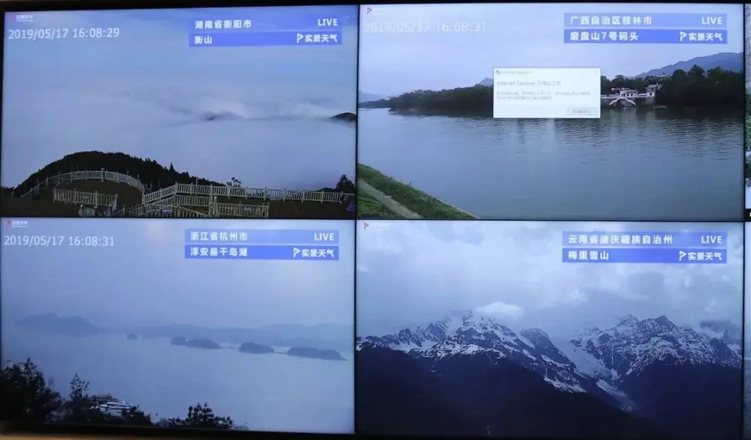 目前,该系统对接的是由华风创新网络公司提供技术支持的全国实景天气采集系统。该系统通过对八十多个国家气象台站和5A景区进行摄像和实时监控,同时,在高清摄像头上加挂包括温度、气压、相对湿度和降水量等天气要素模块,并向中央气象台会商室进行视频的实时回传,使预报员能够在会商室内通过“天空之眼”终端的动态显示掌握这些区域的能见度、云量、雨雪等天气状况,为预报员进行天气监测和预报提供最直观的参考依据。