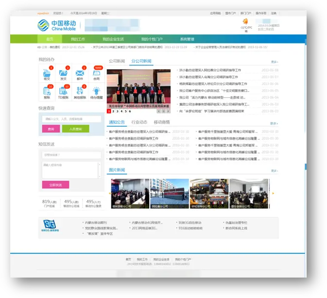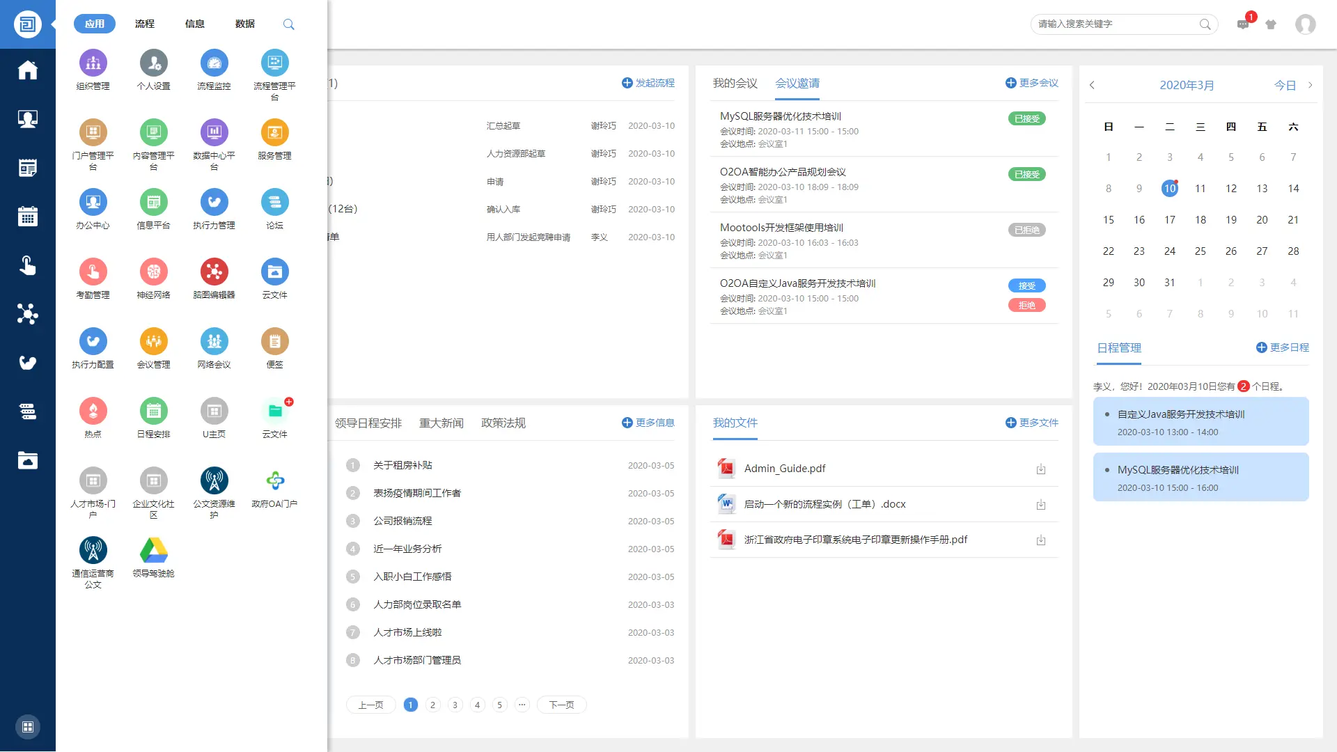 这个是协同办公平台的默认首页,它提供待办事项,需要参加的会议,日程管理等等,让员工更能关注自己的工作。