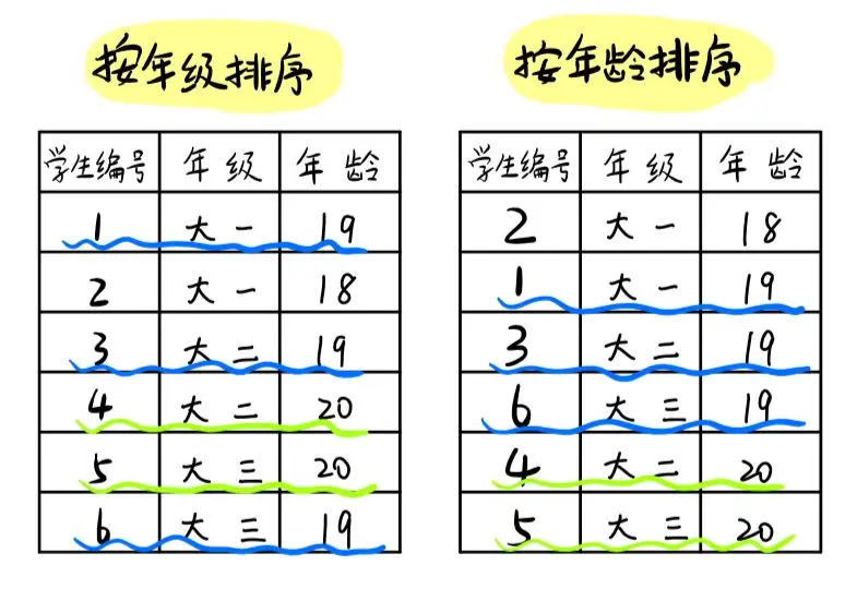 这是因为,稳定的排序算法能够保证在排序过程中,相同年龄的同学,在排序之后,他们的顺序不发生改变。由于第一次我们已经将学生按年级排序好了,于是在第二次排序时,我们运用稳定的排序算法,相同年龄的学生依旧按年级保持顺序。