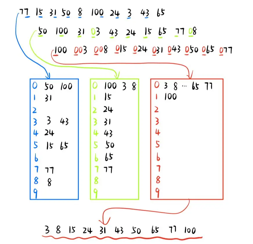 基数排序算法中,基于位数0-9的排序有点类似计数排序,如果大家对代码有所疑惑,可以多看几次计数排序的思路和代码。