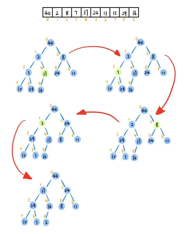 当我们需要维护一个大小为n的堆时,一般从下标n/2的位置不断向前移动。如下图,我们首先判断下标为4的元素,其满足堆的定义。然后我们判断下标为3的元素,使其与值为29的子节点发生交换。依次循环,当下标为1时,值为2的节点需要不断与子节点发生交换,直到叶子节点的位置。具体实现如下图:
