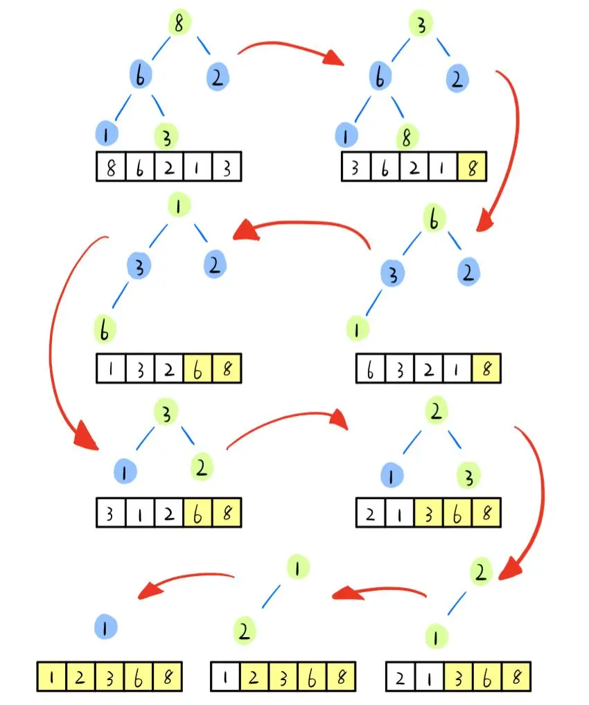 根据“大顶堆”的定义,堆顶元素即为整个数据中的最大值。于是当我们建好堆后,我们将堆顶元素与堆中最后一个元素交换,即将堆中最大元素放在了数组中的最后一个位置。此时,因为我们将较小的元素放在了堆顶,所以我们需要对其进行堆维护(heapify).维护完成后,堆顶元素为此时堆中的最大元素,然后继续重复上面的操作,反向填充数组,直到最后堆中剩下一个元素,即在数组的首位置。