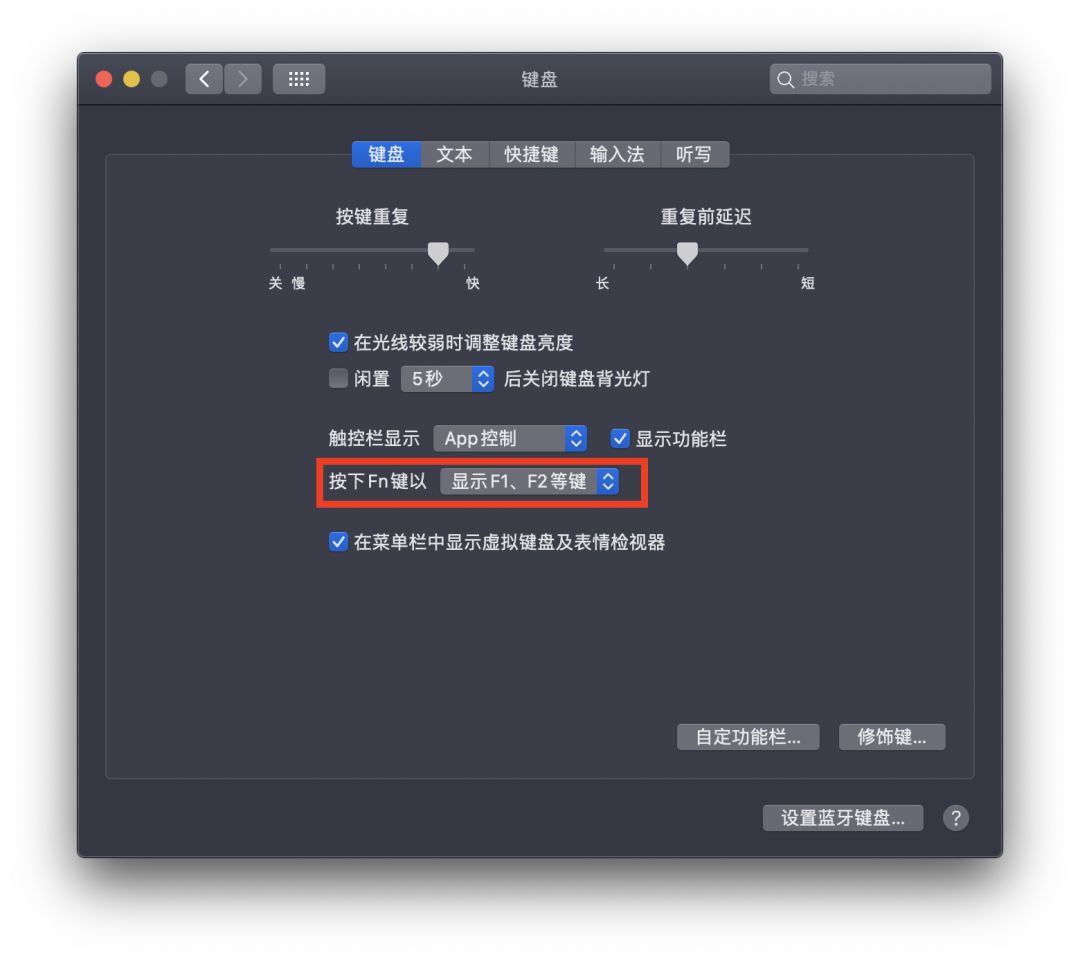 "按下 Fn 键以" 选择 “显示F1、F2等键”:
