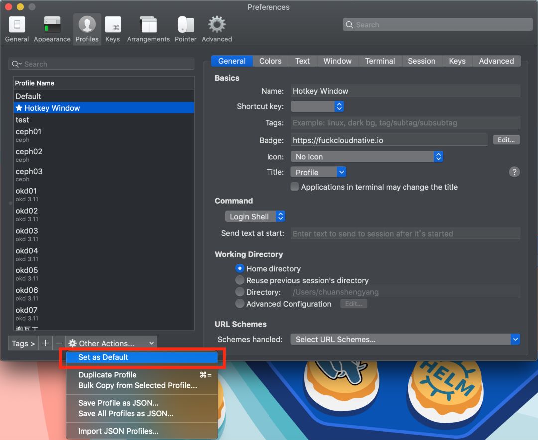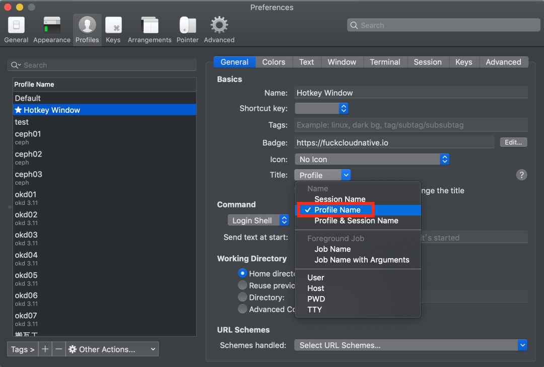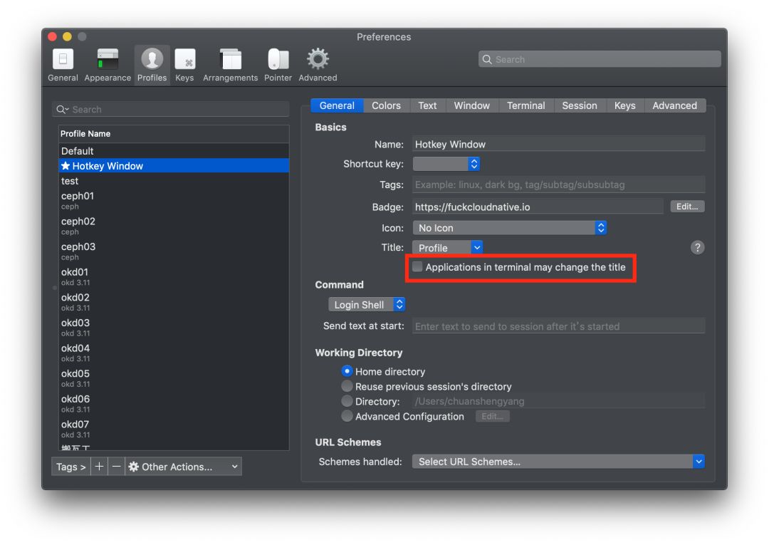 如果你要为自己代言,新建任何一个终端窗口都想打上自己的 Logo,可以在 Preperence → Profiles → General 进行设置。
