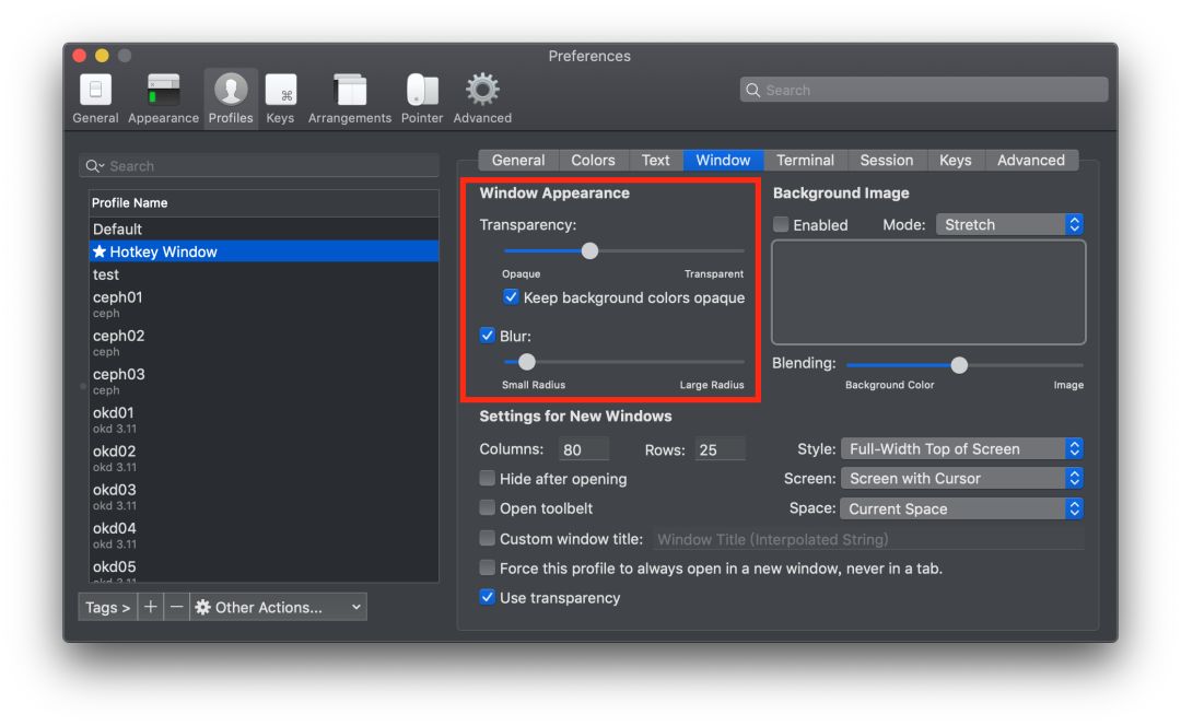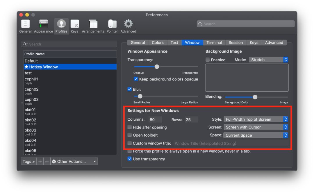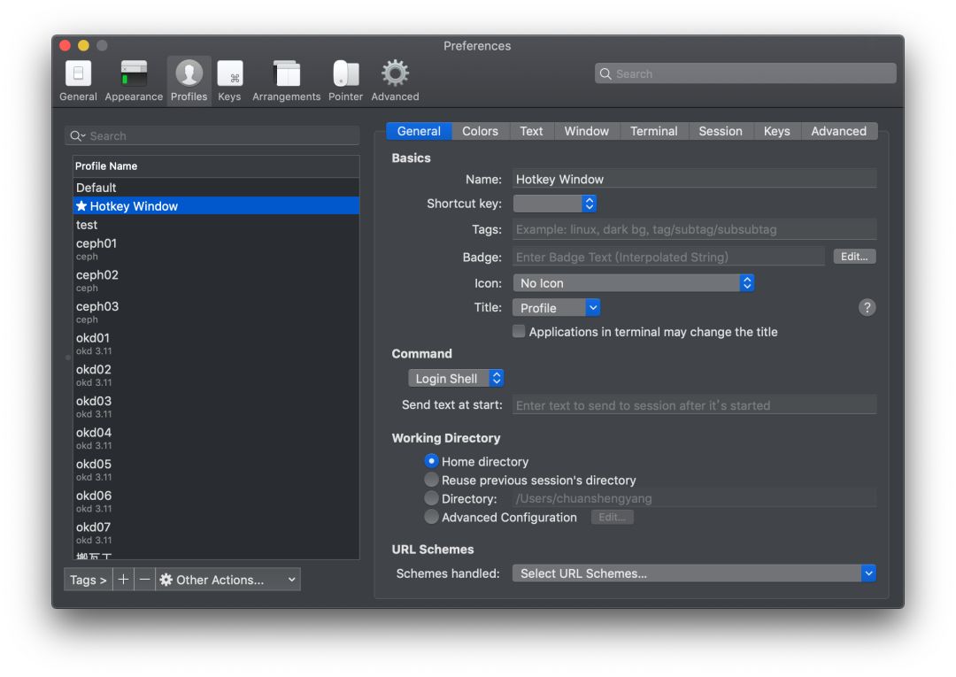 首先打开 Preperence → Profiles,新建一个 Profiles,取名 HotKey Window。
