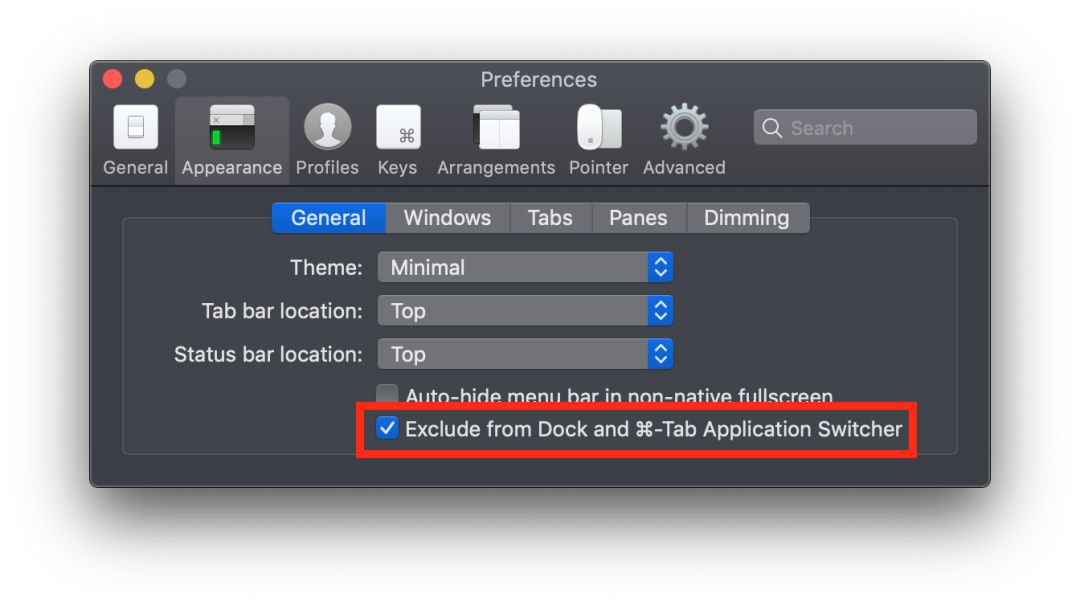 勾选 Exclude from Dock and ...,更改设置之后下次你再重新打开 iTerm2 就会变成这个样子: