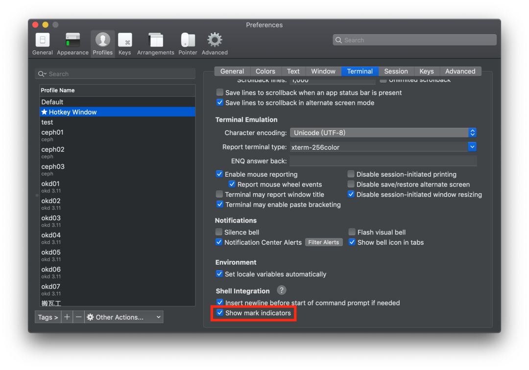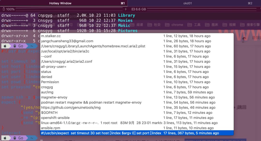 iTerm2 可以与 unix shell 集成在一起,在安装了 iTerm2 的 shell 集成工具后,可以在 iTerm2 中看到命令历史、当前工作目录、主机名、上传下载文件等。