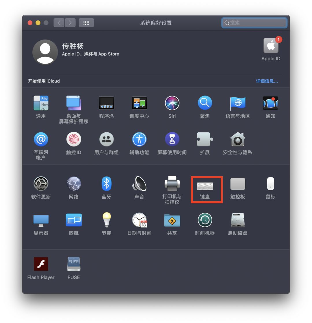 对于没有 Touch Bar 的 MacBook,我们可以这么设置,首先打开系统偏好设置,选择键盘设置。