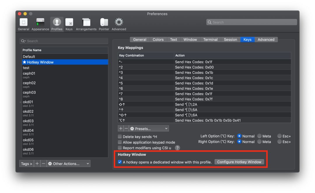 在 Preperence → Profiles → Keys → HotKey Window 进行设置