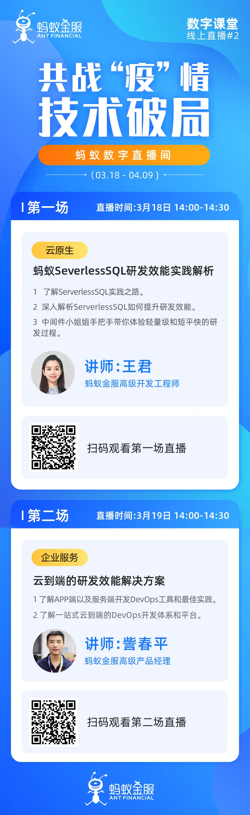 蚂蚁金服“共战‘疫情’,技术破局”数字课堂线火热直播中,本周三和周四连续两场,带你深入解析ServerlessSQL如何提升研发效能和云到端的研发效能解决方案程。