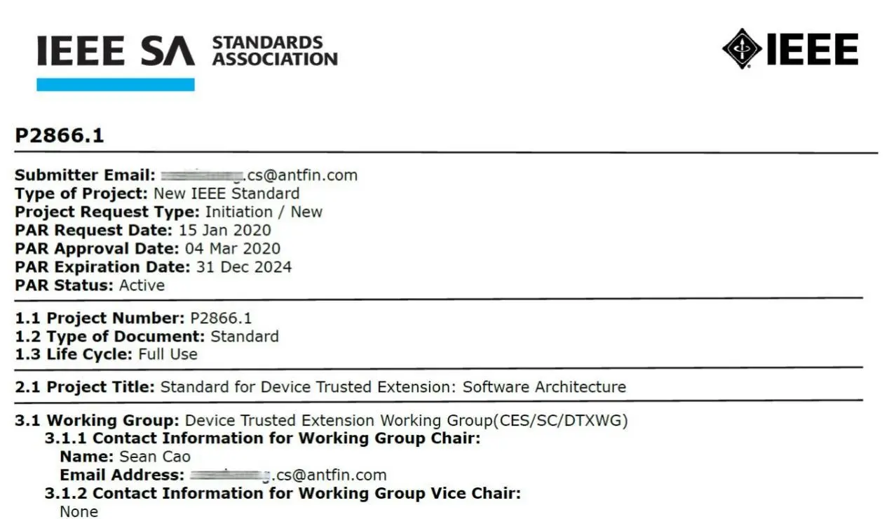 近日,在电气和电子工程师协会(IEEE)举行的新标准项目评审会上,蚂蚁金服提交的P2866.1“Standard for Device Trusted Extension: Software Architecture”国际标准项目顺利通过立项评审,这也是IEEE在智能设备领域首个立项的设备可信扩展标准。
