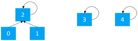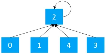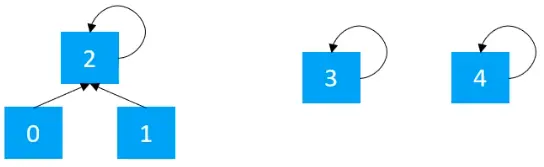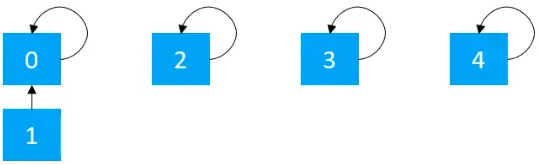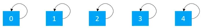 前面介绍了并查集的两种实现方式,不过,不管是使用哪种方式实现,都需要对数据进行初始化,初始化时,每个元素各自属于一个单元素集合。例如开始的时候,有如下的5个节点,其中索引0的元素存储元素0,索引1的元素存储元素1,索引2的元素存储元素2,索引3的元素存储元素3,索引4的元素存储元素4